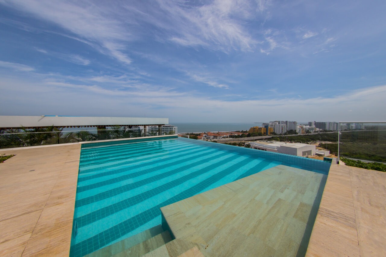 Psicina en la terraza, Jacuzzi, vista al mar, Gimnasio y recepción.
